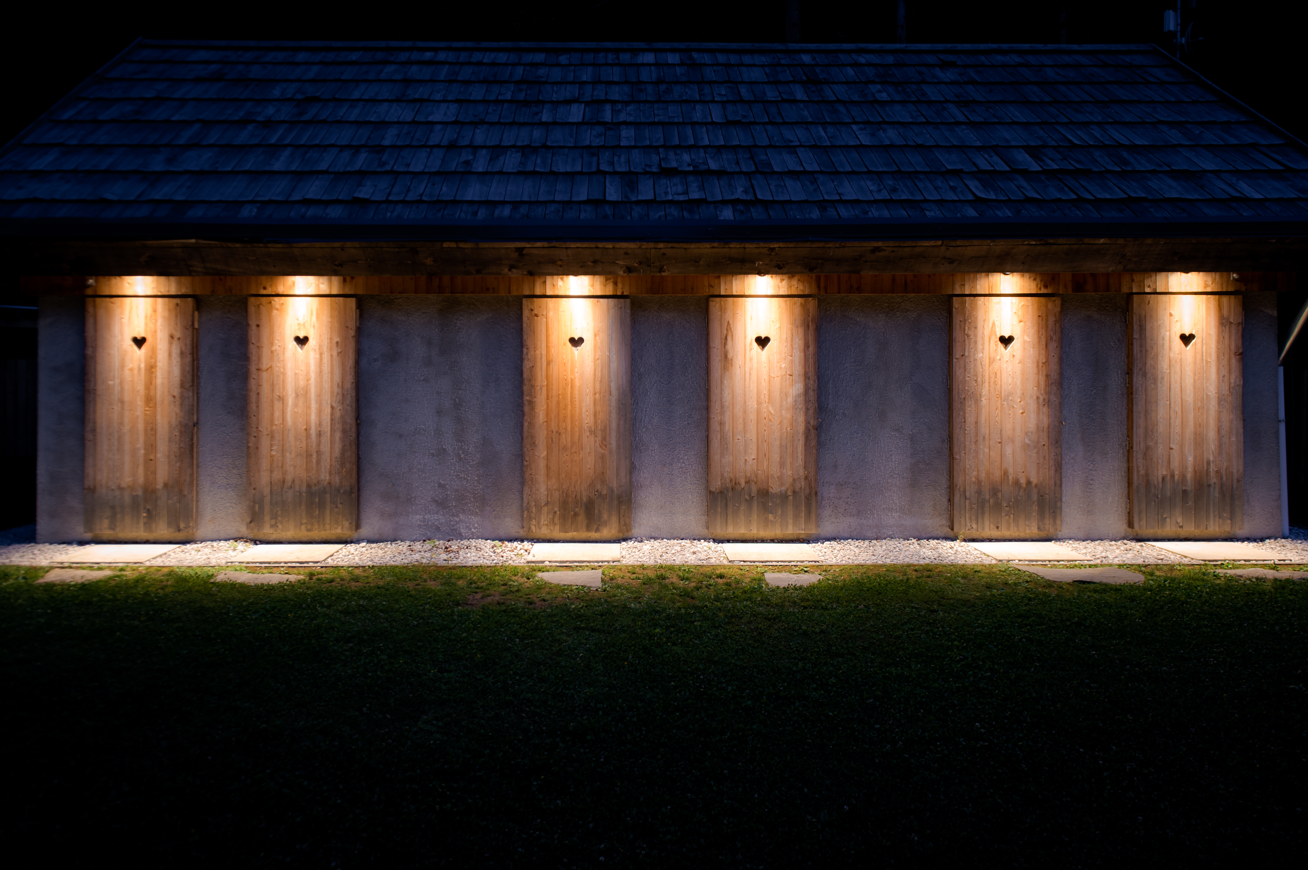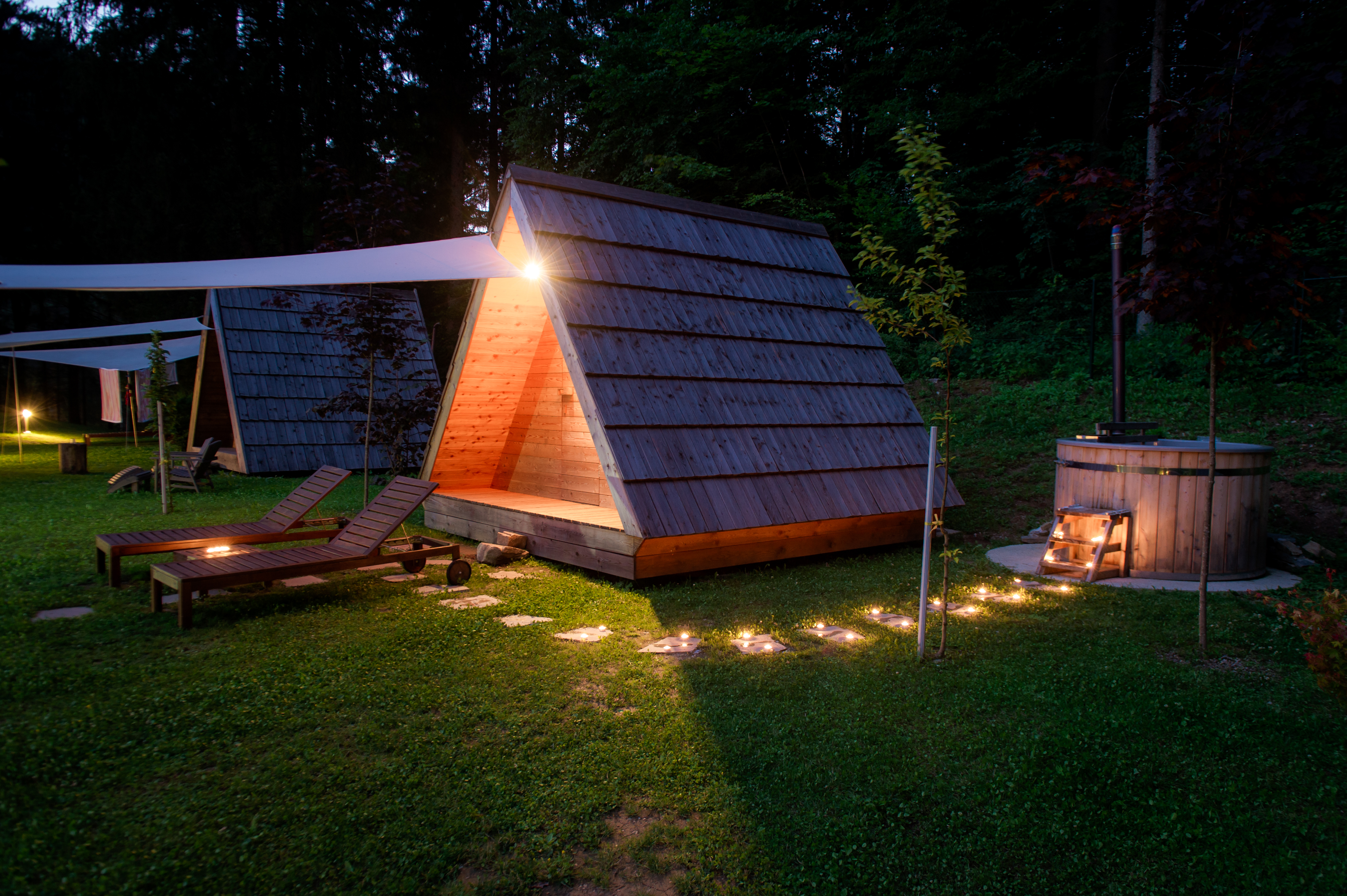 Pričakuje vas 12 lesenih glamping hišk, vsaka z urejenim zunanjim prostorom z udobnimi ležalniki in senčno ponjavo. Nekatere od hišk imajo tudi ogrevane zunanje kadi za romantične trenutke pod zvezdnim nebom.