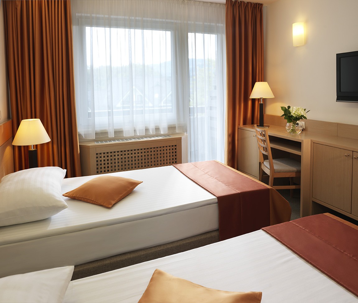 Udobna dvoposteljna soba z balkonom s pogledom na park. V sobi (18 - 20 m2) z dvema ležiščema širine 90 cm ali enim ležiščem širine 180 cm je pisalna miza, televizija, brezplačni WIFI dostop ter kopalnica s tušem in WC.