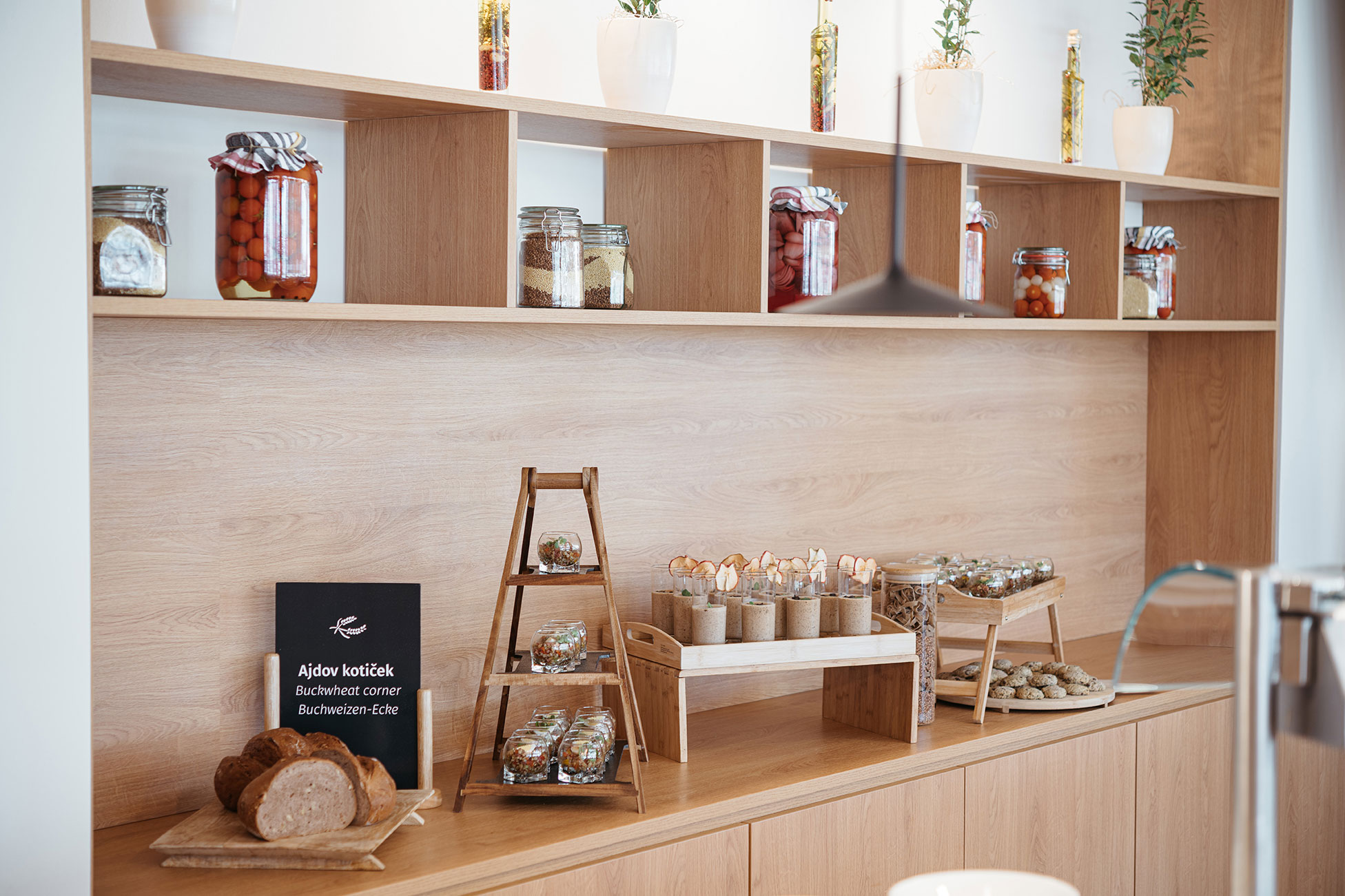 Hotelske sobe so opremljene s toplimi naravnimi materiali, njihova posebnost pa so vzglavniki, polnjeni z ajdovimi luščinami, ki delujejo antivirusno in antibakterijsko, obenem pa se popolnoma prilagodijo telesu in nudijo občutek mikromasaže.