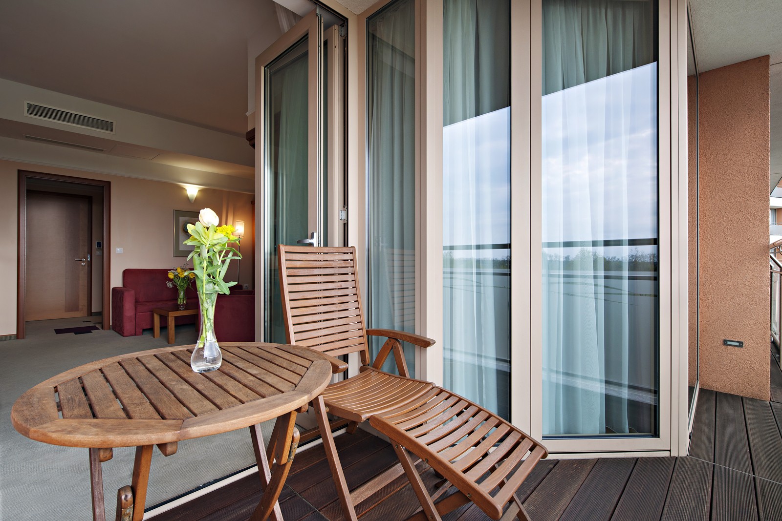 Elegantna in udobna suita z zakonskim ležičem (180 cm) in pogledom. V sobi veliki 39-49 m2 je kopalnica s kadjo s termalno in običajno vodo s tušem, ločen tuš in WC, balkon, pisalna miza in sofa.