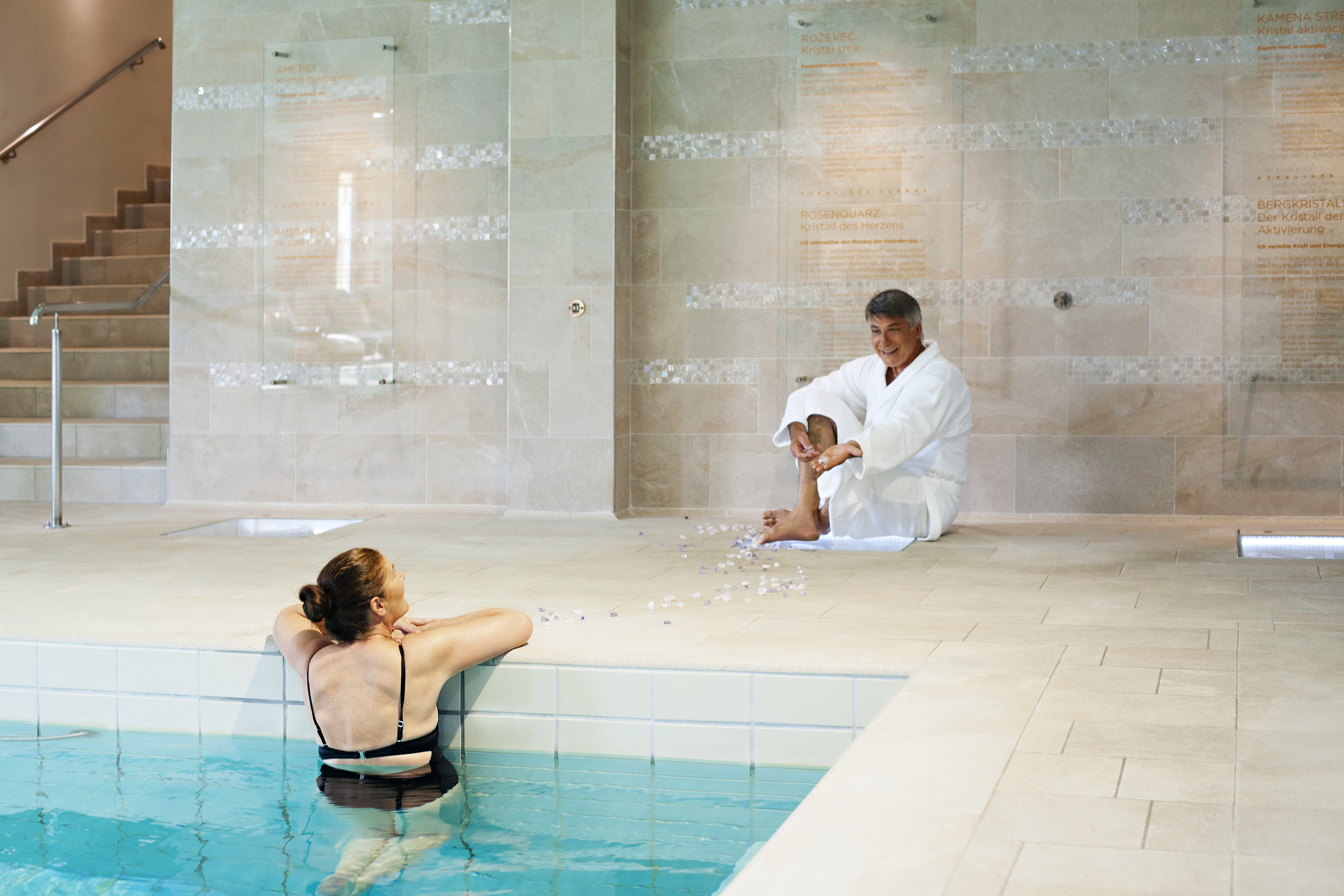 - 3 hotelski bazeni: tematsko notranje termalno kopališče s potjo kristalov in svetlobno (kromo) terapijo v počivalnici, zunanji rekreacijski bazen in terapevtski bazen