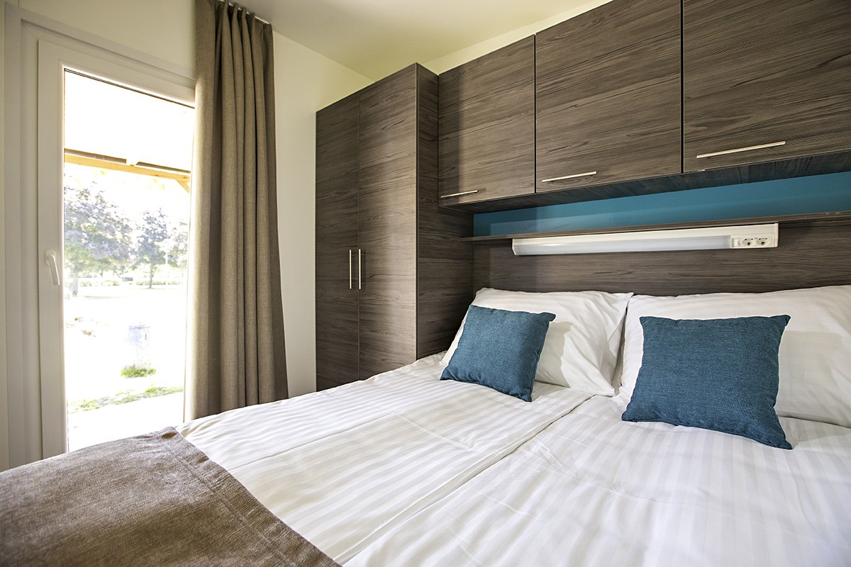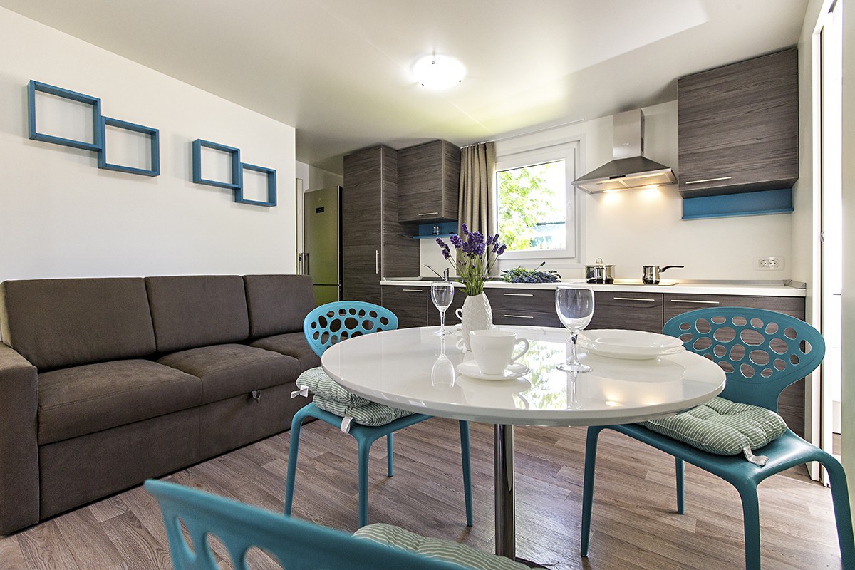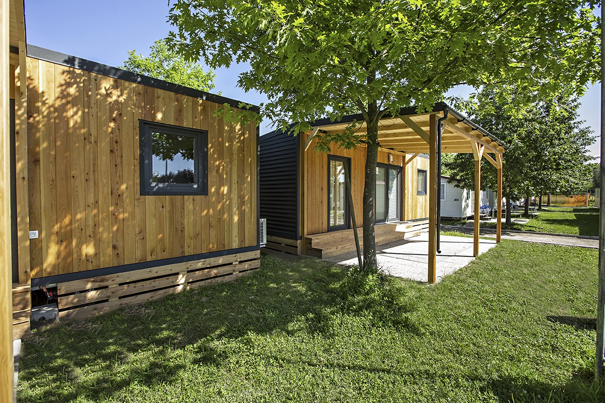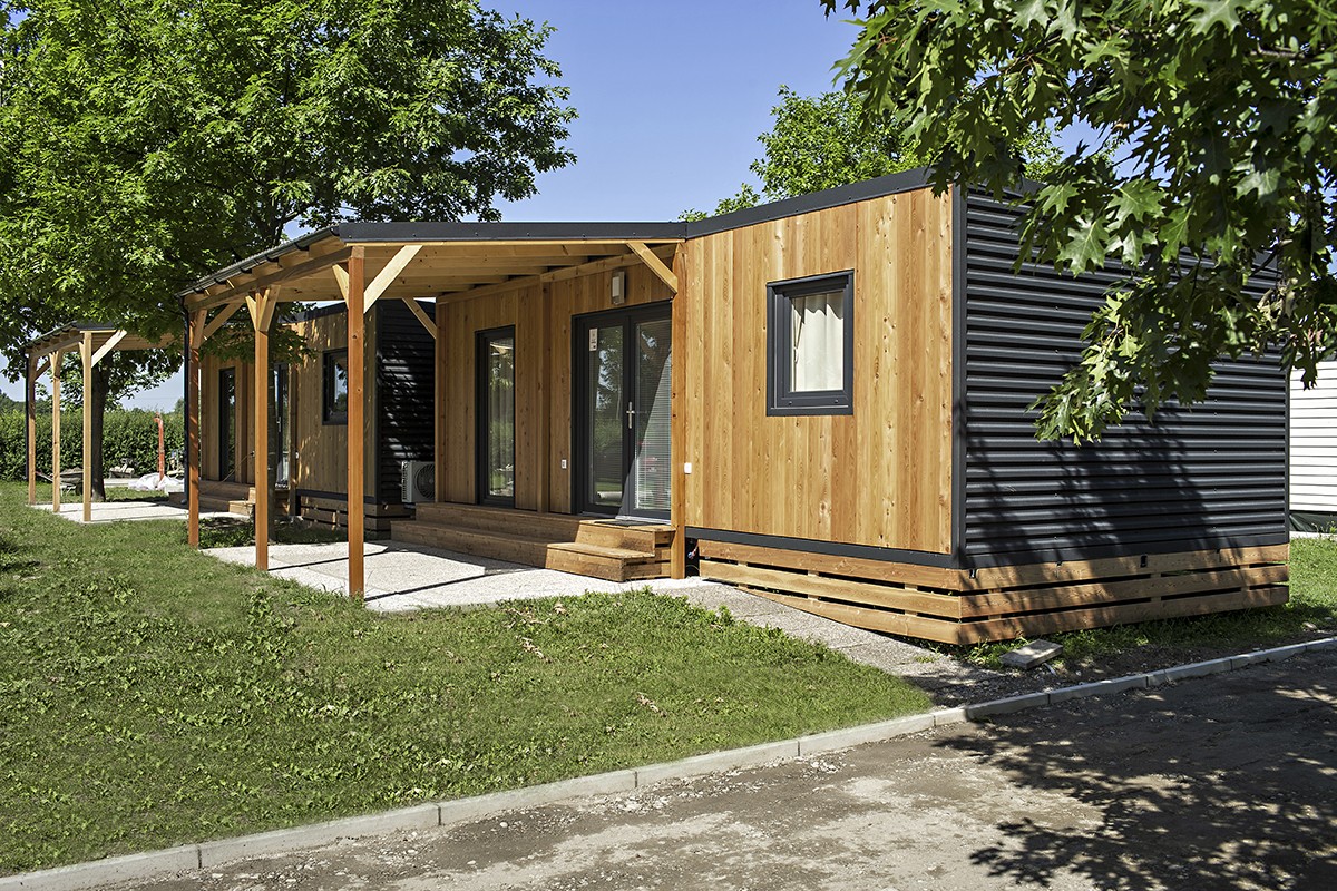 Udobna mobilna hišica za štiri osebe s francoskim ležiščem (160 cm) in ločenima ležiščema (90 cm) s pogledom na park. V hišici veliki 34 m2 je kopalnica s tušem in WC-jem, terasa, jedilna miza, dvosed in kuhinjska niša