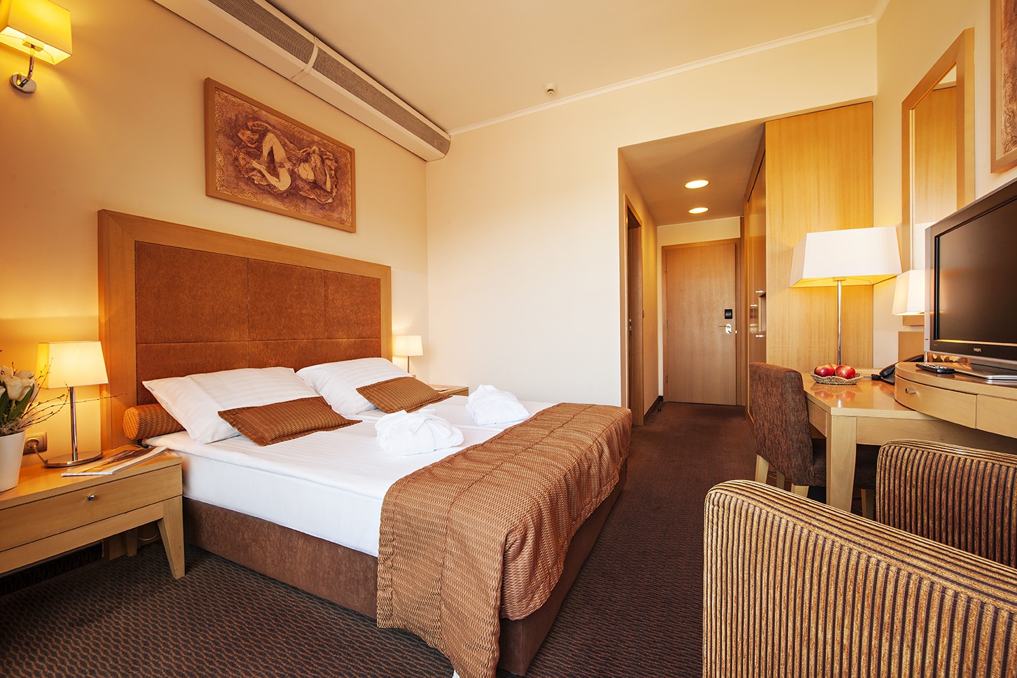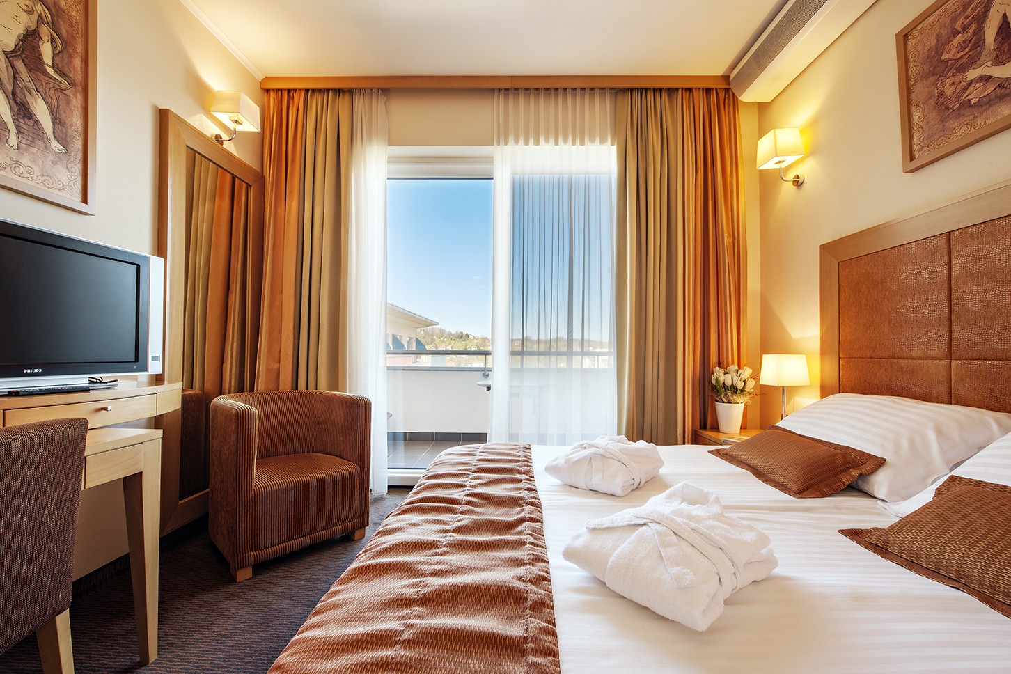Elegantna in udobna dvoposteljna soba s francoskim ležiščem širine 160 cm in balkonom. V sobi (20 m2) je kopalnica s tušem in WC-jem, pisalna miza in stol.