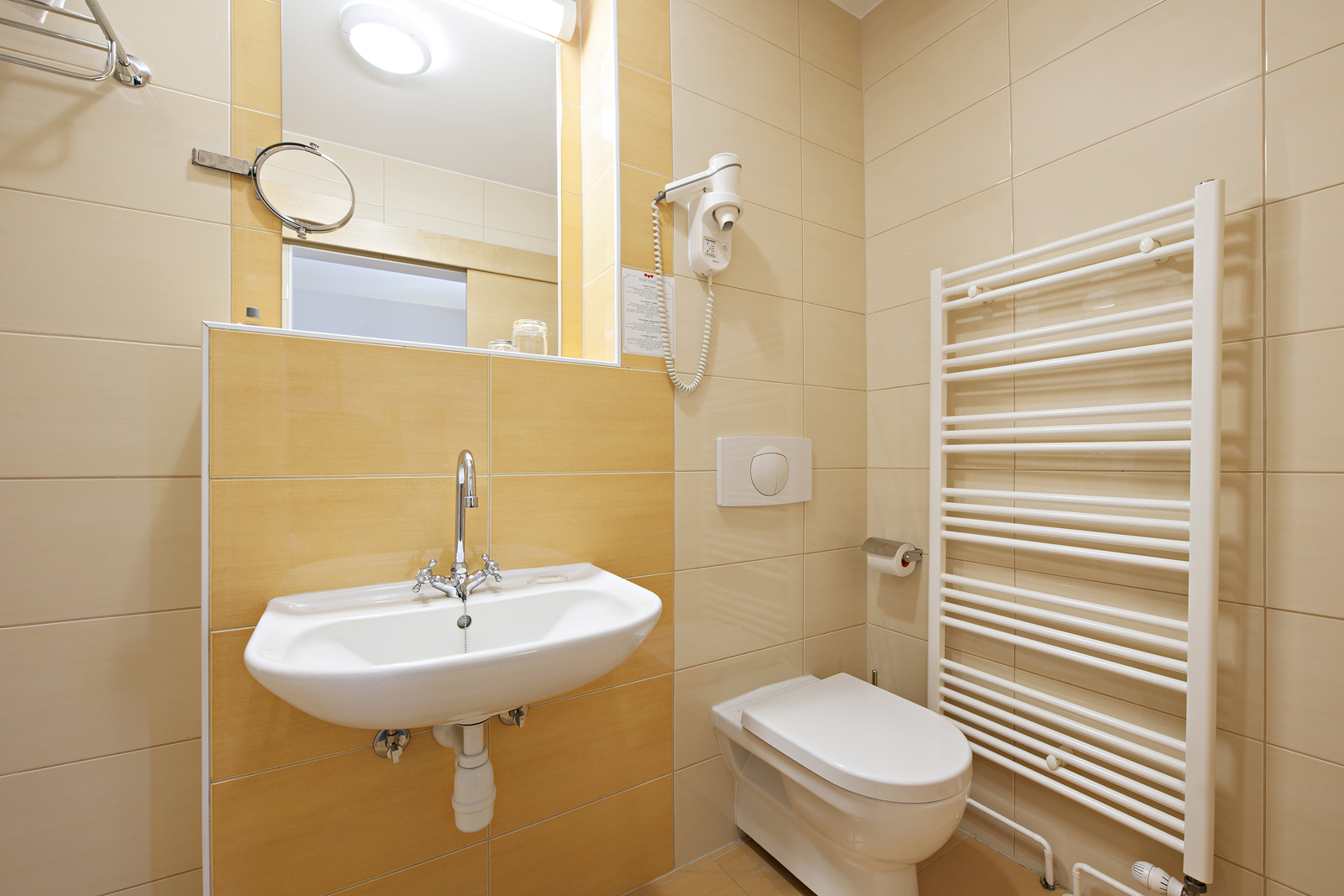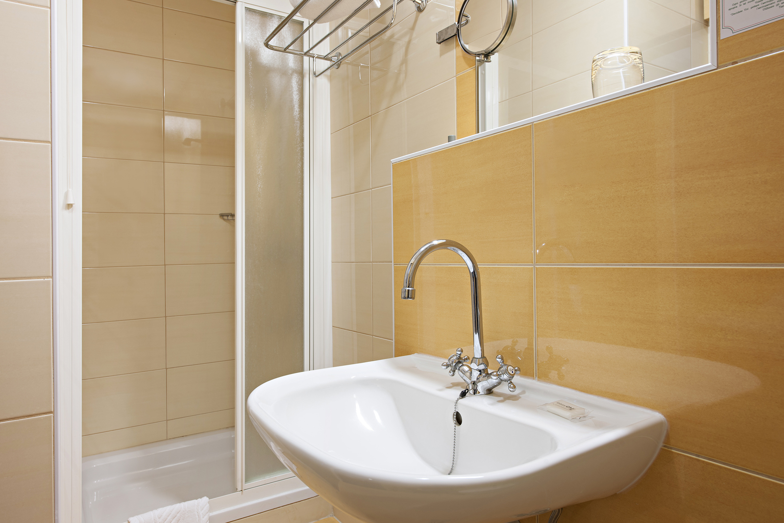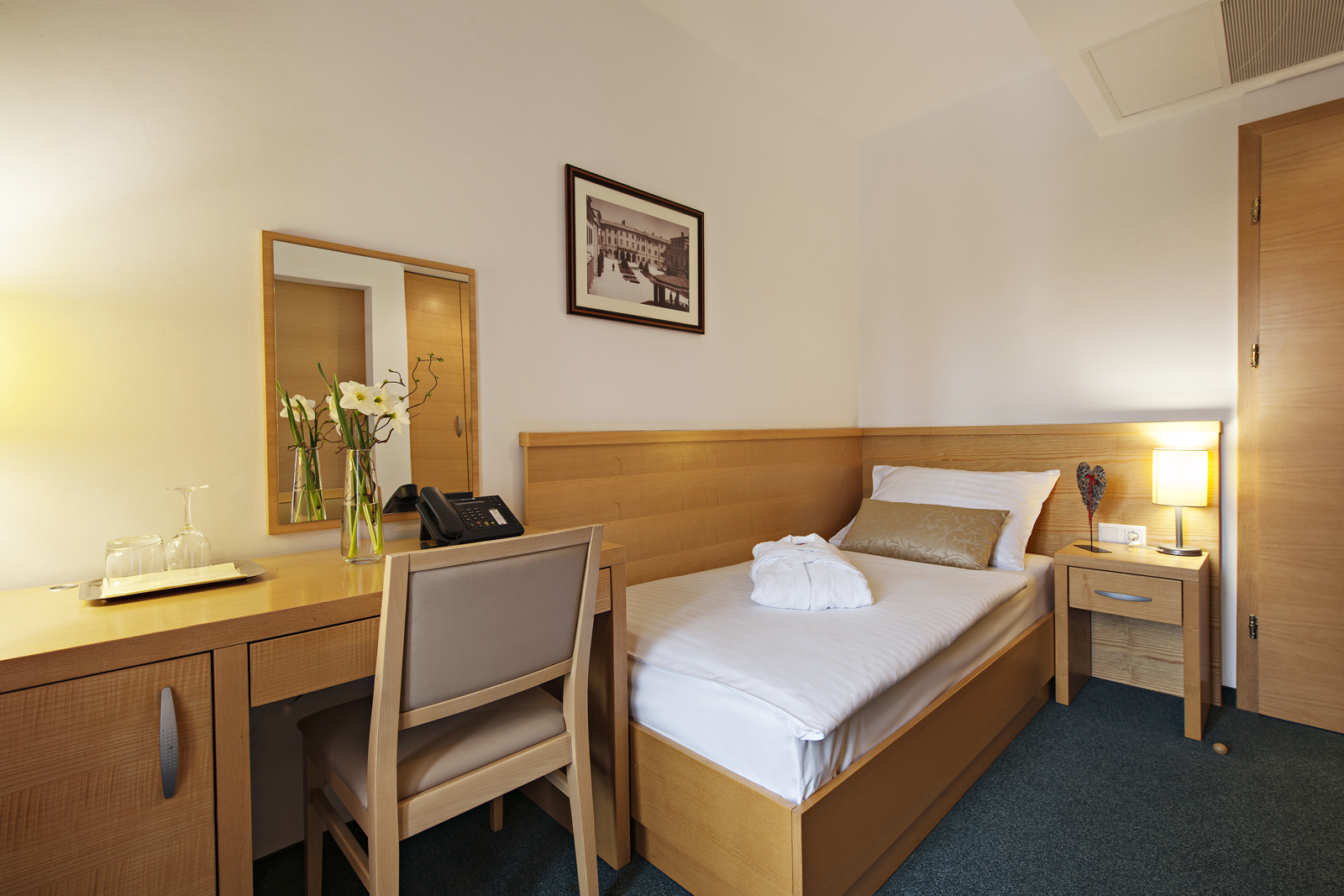 Udobna enoposteljna soba z enojnim ležiščem (90x190 cm) in pogledom na park. V sobi veliki 12,9 m2 je kopalnica s tušem in WC-jem, pisalna miza.